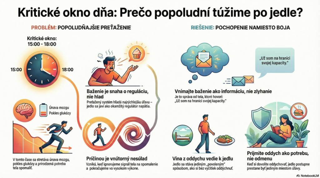 Možno to poznáš. Celý deň funguješ „normálne“. Ješ rozumne, máš plán, máš motiváciu. A potom príde popoludnie. Medzi treťou a šiestou sa niečo zlomí. Objaví sa nepokoj, nejasná túžba, potreba niečo zjesť, vypnúť, uľaviť si. Často spolu s tým príde aj myšlienka: „Je mi to jedno.“